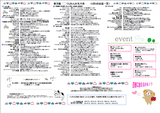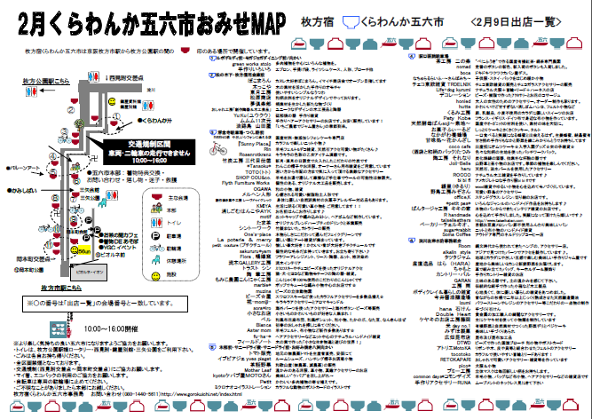 2014-02-06 2/9お店map・出店一覧 お知らせ お待たせしました!! 2/9(日)のお店mapと出店一覧です 今月もたくさんのお店が出店します 気になるお店をチェックして五六市へGO~ 拡大する