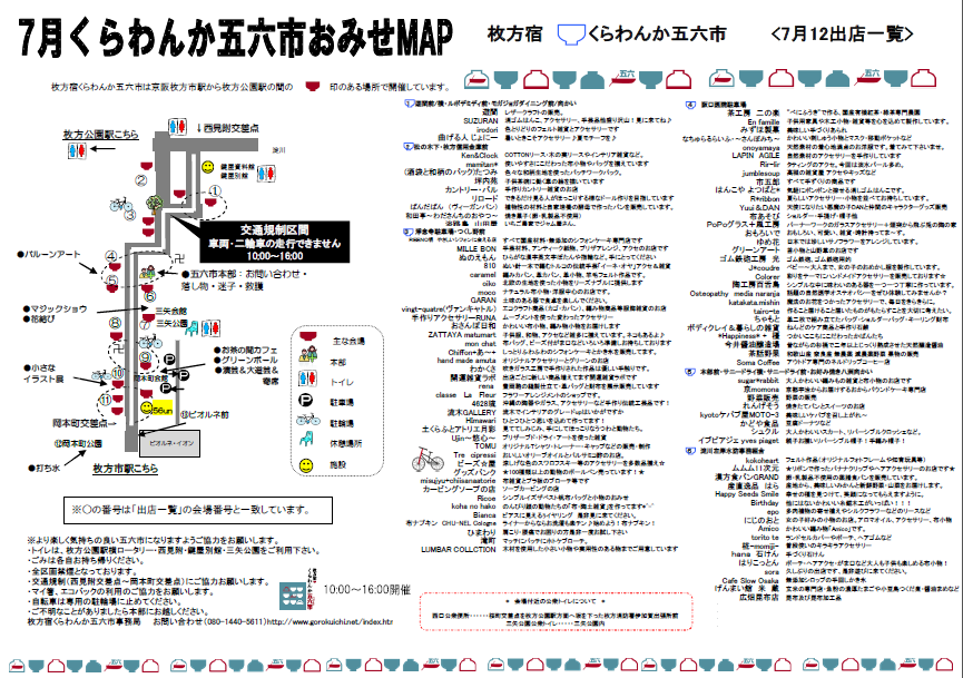 枚方宿くらわんか五六市は毎月第2日曜日に大阪府枚方市で開催される手作り市です。200店を超える個性豊かなお店が数多く出店いたします。枚方宿歴史街道を散策しながら手作り市をお楽しみください。