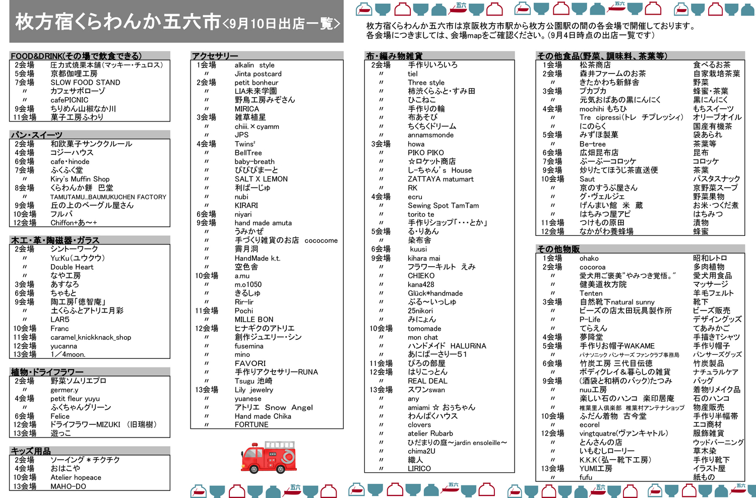 五六市は、当日午前6:00の段階で枚方市に大雨・洪水・暴風・暴風雪・大雪のいずれかの警報が出ている場合は中止とさせていただきます。 中止の場合は当日HPでもお知らせいたしますのでご確認ください。